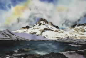 | In July 1999 Phil Benefiel (older brother of CV '70 classmate Susan Benefiel) and Jeffrey Scott (husband of CV '70 classmate Mollie (Brownell) Scott) hiked to Thousand Island Lake in a planned rendezvous with Bill Edwards and the rest of Les Pétomanes. While a rendezvous eluded us that day, Jeffrey took the opportunity to paint this stunning watercolor of the outlet of Thousand Island Lake. |